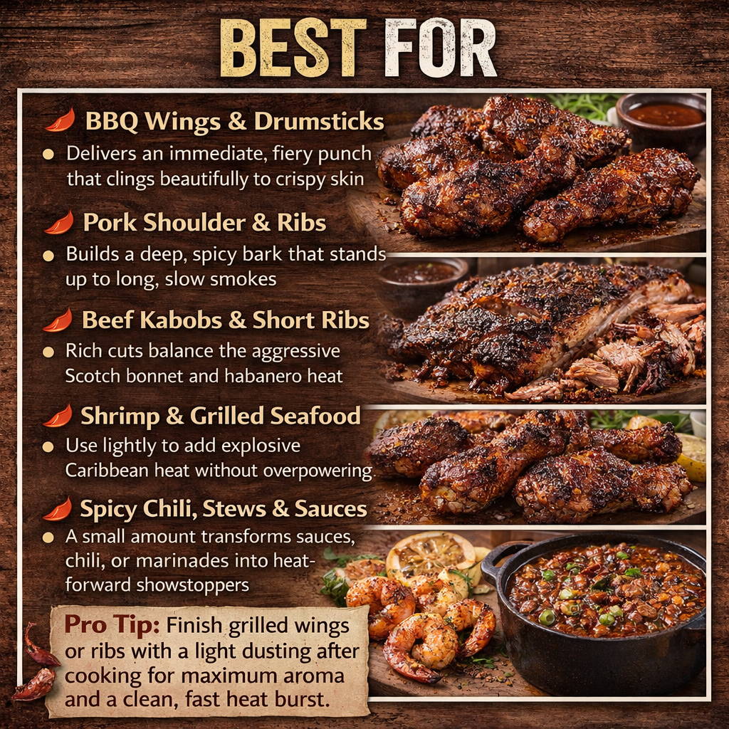 Pro Tip: Finish grilled wings or ribs with a light dusting after cooking for maximum aroma and a clean, fast heat burst.