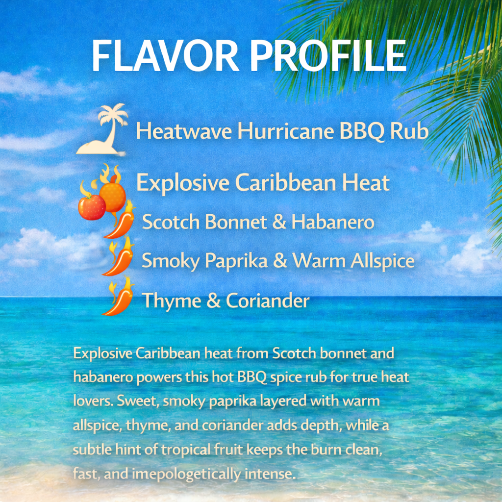 Our hot Island Blaze Caribbean BBQ Spice Rub is built for true spice lovers. It uses Scotch bonnet and habanero peppers to deliver explosive heat. As a result, the burn is fast, clean, and intensely satisfying. Sweet, smoky paprika adds depth, while allspice, thyme, and coriander keep the flavor bold and clear.